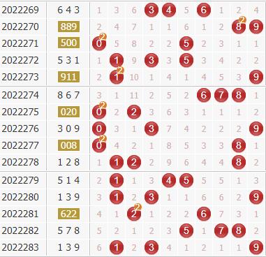 012路分析:组选号码012路比为66:44:66,其中0路号码轮空14期,1路号码轮空18期,2路号码轮空10期,本期012路比参考0:2:1组合。