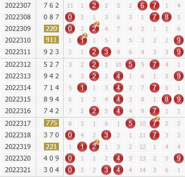 跨度分析:上期跨度开出了4,跨度近期分布在1-9区段,分布较广,本期注意重复跨度,看好跨度4。
