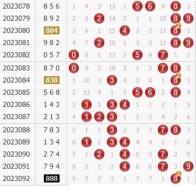 福彩3D第2023092期开出奖号:888,奖号特征为:豹子,奇偶比0:3,012路比0:0:3,大小比3:0。 3d第2023093期综合分析如下: