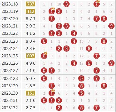 跨度分析:在第133期同期历史奖号中,号码跨度大小比为17:4,012路比为8:4:9,奇偶比为11:10,跨度开出频次分别为:跨度8出现6次,跨度5、6、9出现3次,跨度3、7出现2次,跨度1、4出现1次,跨度0、2出现0次,本期关注大跨度出现,一码跨度参考5。