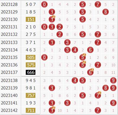 本期号码上数十期开奖号码为757,百位7,对应数2、补数3;十位5,对应数0、补数5;个位7,对应数2、补数3。
