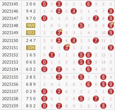 本期号码上数十期开奖号码为247,百位2,对应数7、补数8;十位4,对应数9、补数6;个位7,对应数2、补数3。