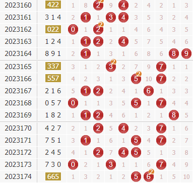 福彩3D第2023174期奖号为奖号:665,组三,奇偶比1:2,大小比3:0,和值17点,002组合,跨度1,合合质,偶偶奇,大大大形态。 3d第2023175期分析如下: