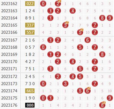 上期开出888,百位8,对应数3、补数2;十位8,对应数3、补数2;个位8,对应数3、补数2。