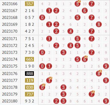 百位号码:第23176期-23180期奖号为:8-1-0-7-9,振幅为9点,分布较分散,本期看好百位走低,注意号码1。