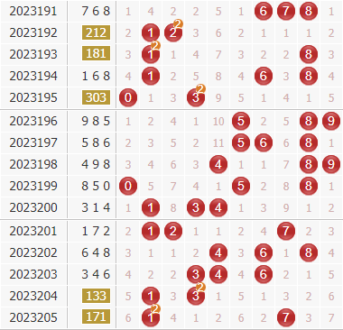 福彩3D第2023205期奖号为奖号:171,其中奖号组选类型为:组三,奇偶比为3:0,大小比为1:2,012路比为0:3:0,和值为9,跨度为6。 3d第2023206期分析如下: