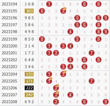 福彩3D第2023208期奖号为奖号:692。奖号形态为组六,大小形态为大大小,奇偶形态为偶奇偶,和值为17,跨度为7。 3d第2023209期分析如下: