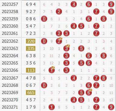 跨度分析:在第272期同期历史奖号中,号码跨度奇偶比为11:10,大小比为9:12,012路比为10:8:3,跨度开出频次分别为:跨度3、4出现4次,跨度6、9出现3次,跨度1、2、7出现2次,跨度8出现1次,跨度0、5出现0次,本期关注奇数跨度出现,一码跨度参考5。