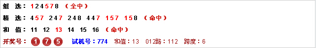 福彩3D第14215期开奖结果:175;奇偶形态:奇奇奇;大小形态:小大大;和值:13;跨度:6;210路:112