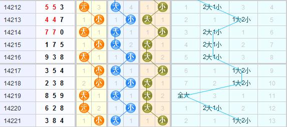 上一期的号码大小组合为2小1大,结合走势图来看,近期大小组合还是以大小搭配组合为主,十期内只开出过一期全大号,全小号已经遗漏13期了,本期可能会继续遗漏。百位近期走势很均匀,本期推荐开大号;十位大号稍微开出的次数多一些,总体来看还是比较平均,且走势很规律,本期推荐小号;个位以大号为主,本期推荐大号。综合推荐:2大1小或2小1大。