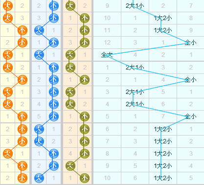 上期开出了小大小,从走势上来看,近期小号走势较大号强。上期开出1大2小,连续五期开出1大2小,近期需重点关注小号。结合近期的大小走势,本期大小形态推荐:小小大、小大小、大小小,近期还需防大大大开出。