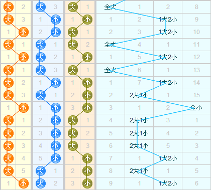 上期开出了小大小,从走势上来看,近期大号走势比较强。15期中有3期开出了全大组合,而全小组合只开出了1期。百位上大号走势明显强势,上期开出了小号,根据走势,本期看好大号开出。十位上大小走势比较平衡,上期开出了大号,连续两期都开出了大号,本期有望继续开出大号。个位上上大小走势比较平衡,连续三期开出了小号,本期看好大号。结合走势,本期大小形态推荐:大大大、大大小、小大大。