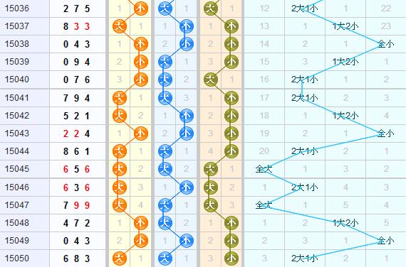 近15期中,全大开出2期,全小开出3期,2大1小开出6期,1大2小开出4期,观察上图可得知,2大小隔1到3期会开出1期,且在遗漏3期的时候,会出现再次开出的现象;而2大1小近期开出的次数比较小,本期要对它进行防守。老夫子推荐1大2小形态,防2大1小形态。