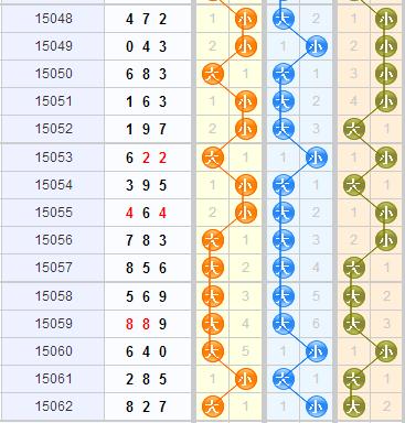 近15期中,全大开出3期,全小开出1期,2大1小开出6期,1大2小开出5期,观察上图可得知,之前的形态都是隔一期再开一次,而近几期开始就开始了连续开的现象,所以本期的话可以继续关注2大1小的开出。
