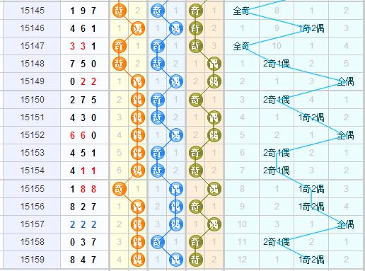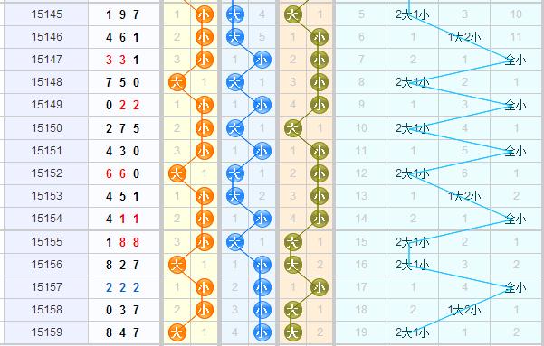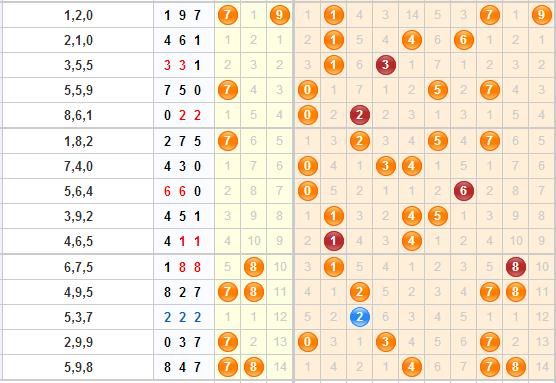 跨度分析:上期跨度4,近期的跨度除了第2015157期开出了跨度0外,其余的跨度还是比较集中的,都开在了3-7之间,预计本期的话还是会开在这之间;