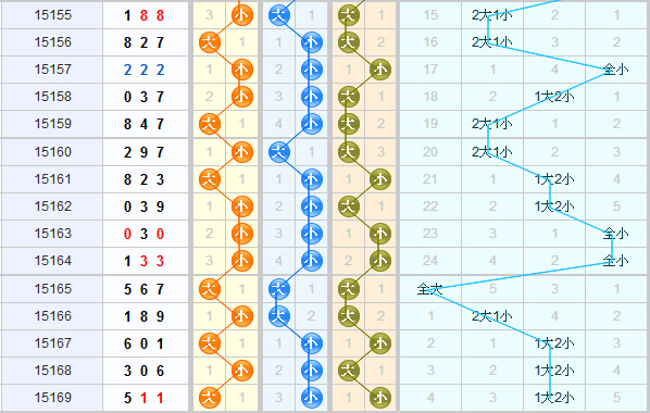 大小分析:百位上近六期小号大号轮流交替开出,走势还算稳定,上期开出大号球,所以看好本期开出小号球;十位上近十五期小号球强势走热,连开现象严重,本期可预防大号球的突袭。个位上大号球走势稍热一些,本期继续关注大号球的开出。