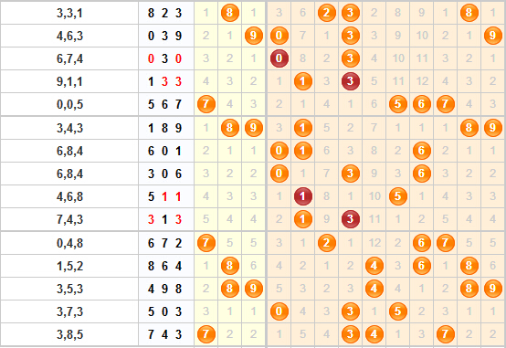 重复号分析:上期开出743,3号球是个重复号,近15期重复号的开出机率很大,上期开出了3号球,本期有可能会继续开出;同时6号球也有连开两次重复号的的情况,所以本期重复号推荐关注3、6