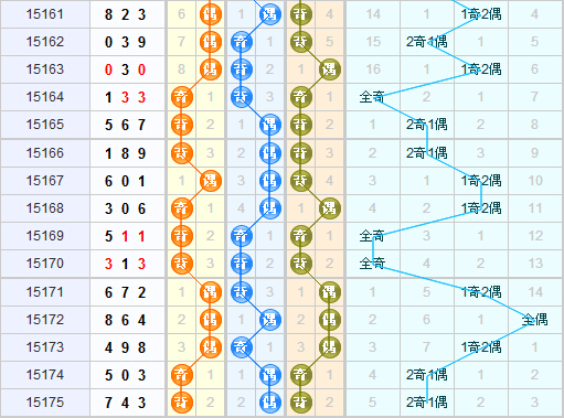 上期开出的是奇偶奇。百位上期开出了奇号球,奇号球连续开出了两期,近期奇号球和偶号球都是3期交替开出的,所以本期百位建议继续关注奇数球;十位上期开出了偶号球,偶号球连续开出了两期,近期偶号球的走势很热,4期中开出了3期,推荐继续关注偶号球的开出;个位上期开出了奇数球,个位上近15期奇数球的走势比较热,偶号球中间有反弹趋势,连开了2期,但是上两期有连续开出了奇号球,所以本期继续看好奇号球的开出;本期奇偶推荐:奇偶奇、奇奇偶