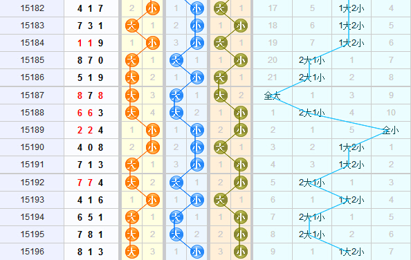 百位上:近15期,开出大号球10期,开出小号球5期,大小比例10:5,很明显大号球开出期数比较多,上期开出大号球,本期建议继续关注大号球的开出;