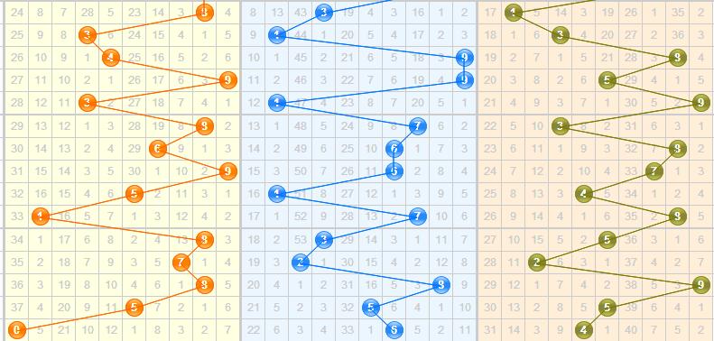 个位上:上期开出4,从近期开奖号的折线看,一般沿着同一个方向开的期数不会超过三期,故本期更看好开比4大的号;其中6号球在个位上已经间隔40期未开,本期需重点关注一下。