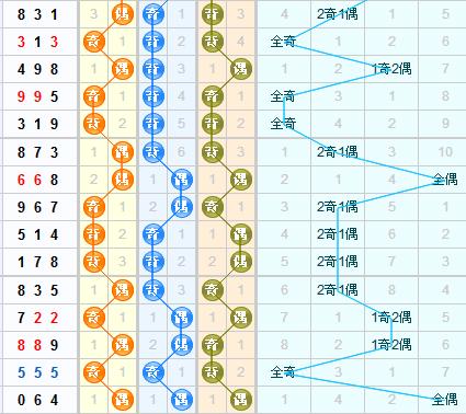 百位上:上期开出偶数,近期百位上的奇偶形态已连续四期呈现出奇偶交替出现的情况,故本期百位上更看好奇数的开出。