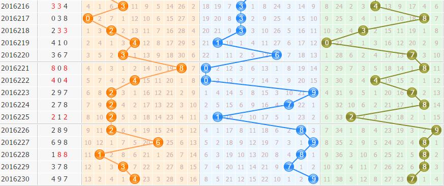 个位数是最难判断的,开出7到8有2次,到0、5、2有1次。首先排除1路的号,再排遗漏期数多的5、6,几率小的8、9,本期选择0、2、3。