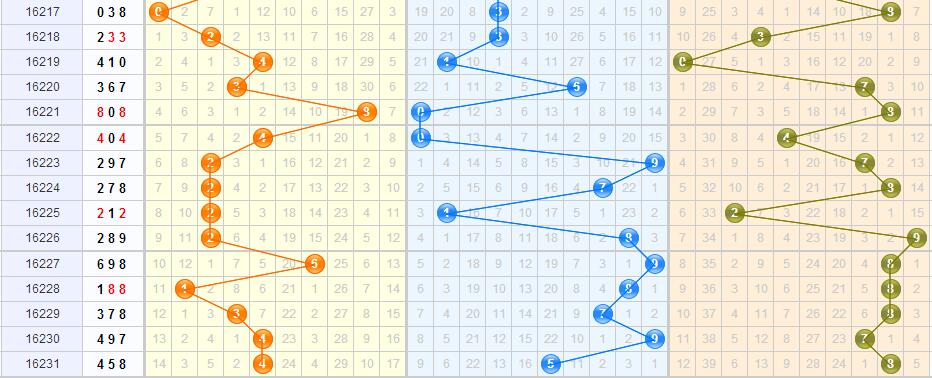 和值推荐:上期开出和值17,和值逐步呈现出走大的趋势,从和值走势图及近期开奖号码走势分析,本期重点关注小和值的开出。