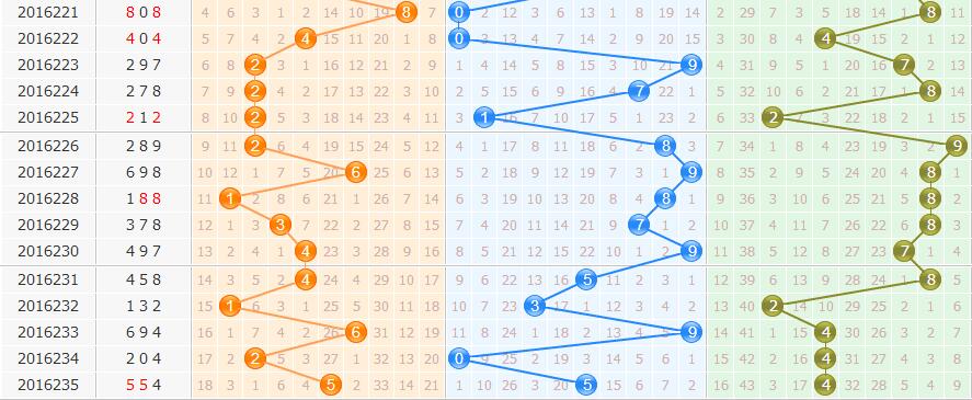 十个位和:235期十个位数字之和为9,根据近期十个位和值分布特征,预测236期十个位和值将会适当上调。