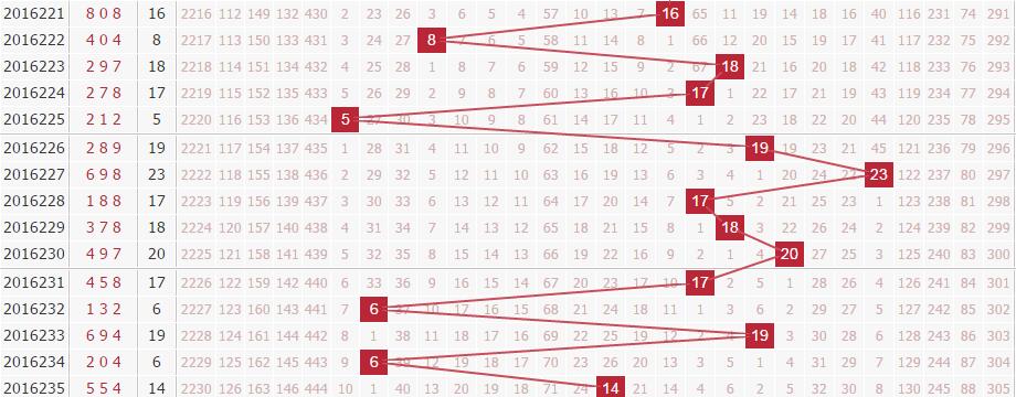 在除3余数走势中,上期开出余2路,本期依其走势推荐余0、2路;依其上面分析,除3余0、2和值推荐:11、15、18、21。16236期和值依其走势关注11、15、18、21。重点关注和值11、18、21。