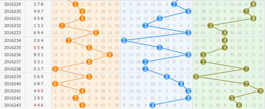 012路分析:243期的除三余数为110路,与前一期相比,1路数值大幅反弹,分析近30期的出号走向,未来一期可以考虑排除0路号码。