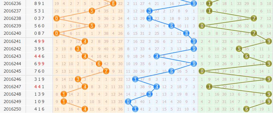 十个和:上期十个位数字之和为7点,观察十个位和值在近期的出现情况,预测251期十个和出现小幅度上扬。