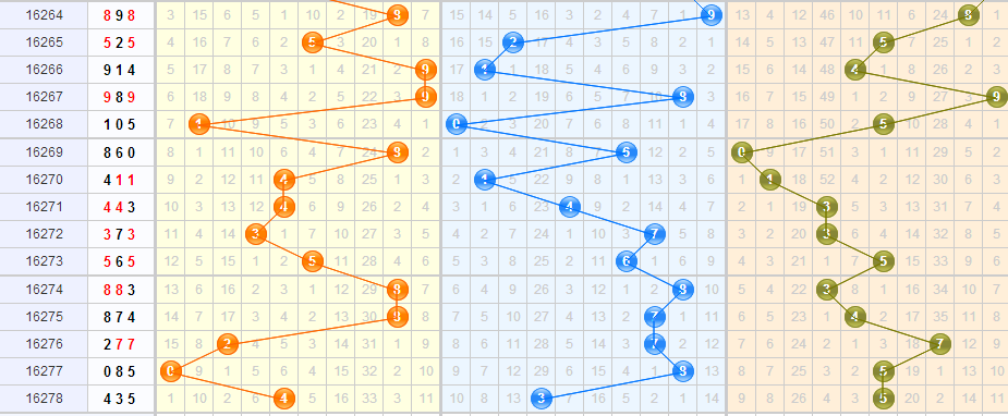 在除3余数走势中,上期开出余0路,本期依其走势推荐余1、0路;依其上面分析,除3余1、0和值推荐:11、13、15、19。16279期和值依其走势关注11、13、15、19。重点关注和值13、15、19。