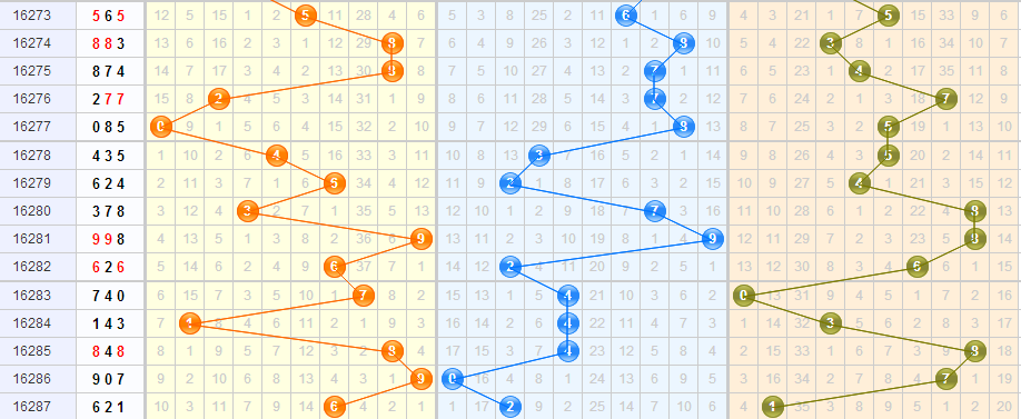 3、和值分析:上期和值9点,和值走势下降,近期和值走势波动幅度不大,本期关注三区和值出号,重点和值关注20防14点。