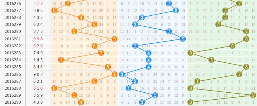和值分析:上期和值为7点,分析和值走势,上期和值大幅下滑,本期看好和值点上涨,取范围15-21点