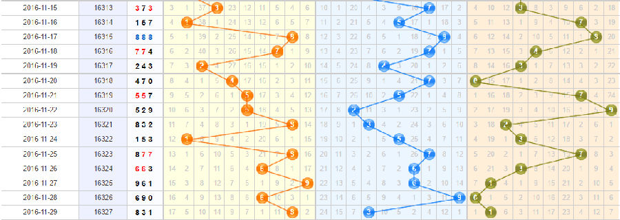 2、和值分析:上期和值为16点,根据和值走势,关注和值范围8-19点。