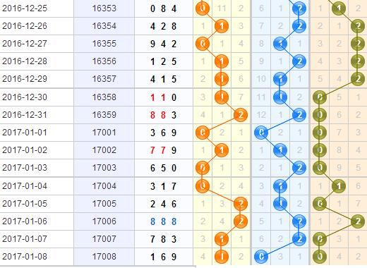 百位:百位号码在上期开出1,通过近期的数据观察,本期百位看好0、2路数值的强势回补。