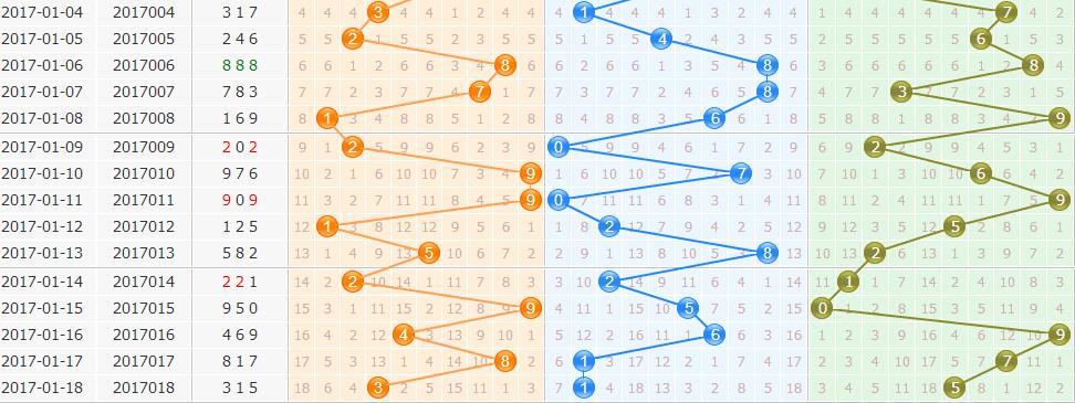 除3余数分析:2017018期012路的比值为1:1:1,根据出号趋势,下一期严防002、022路组合出号。