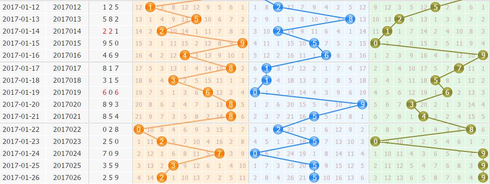 3、和值分析:上期和值16点,和值走势下降,近期和值走势波动幅度不大,本期关注二区和值出号,重点和值关注14防16点。