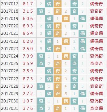 质合分布:2017031期质质合组合上奖,号码的质合比处在一个非常不平衡的状态,17032期提防合数码的大量补位。