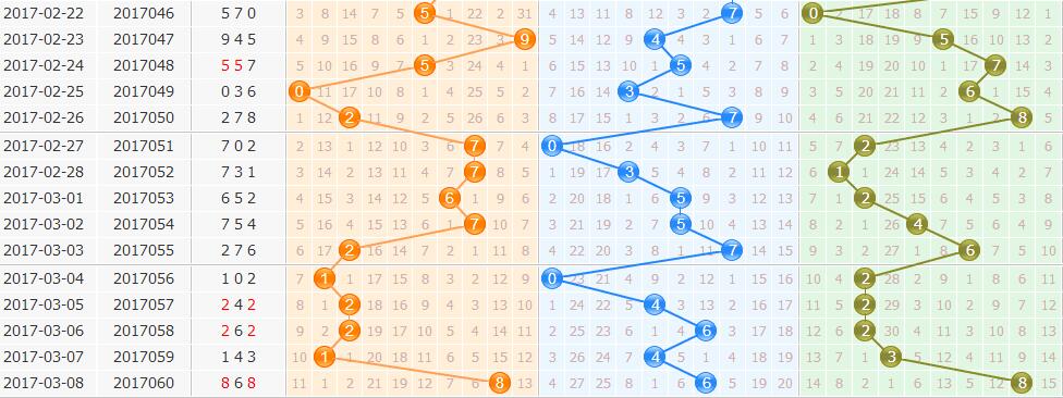 跨度分析:上期跨度2,属于小跨度开出,分析近期各区出号走势,本期跨度值为看好大跨度值,重点关注6跨防2跨。