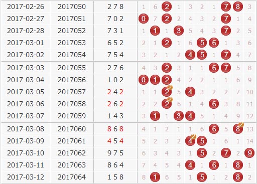 和值分析:上期和值为14点,根据和值走势,关注和值范围8-19点。