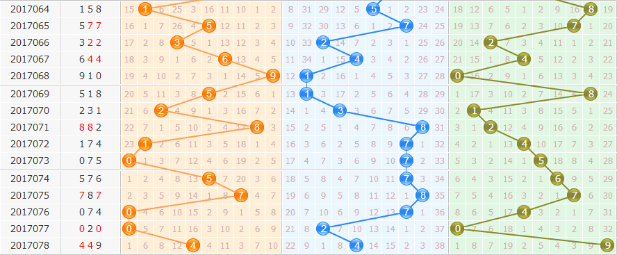 012路分析:078期的除3余数为110路,从近期的012路号码走势上看,下一期0路数值有望增强出号。