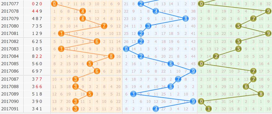 3、和值分析:上期和值8点,和值走势下降,近期和值走势波动幅度不大,本期关注二区和值出号,重点和值关注15防21点。
