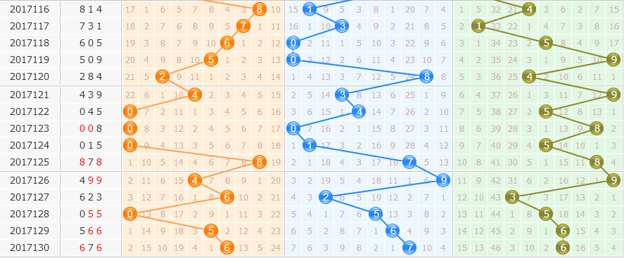 和值走势:近十期和值分布为16-9-8-6-23-22-11-10-17-19,一区和值开出2期,二区开出5期,三区开出3期。下期重点二区和值出号,重点关注和值16点。