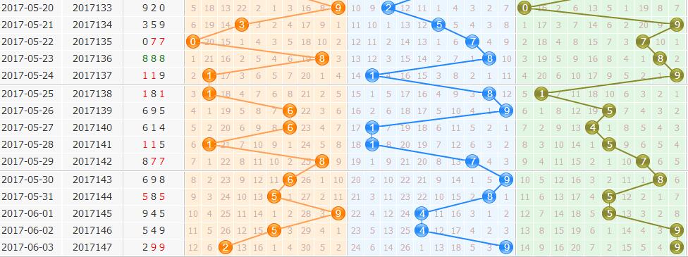 2、和值分析与推荐:上期开出和值20,开出大和值,从和值大中小走势图分析,这期关注大和值的开出,推荐和值:19、20、11;二码和值:19、20