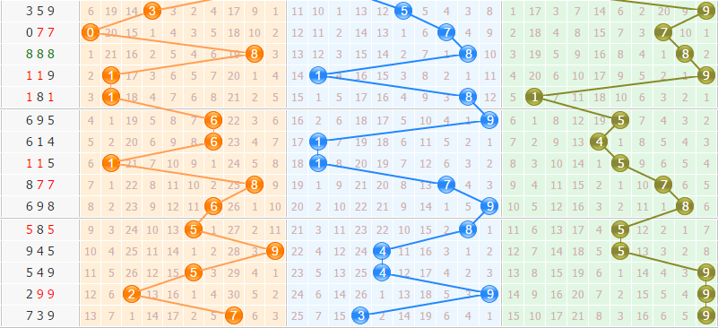 本期号码上数十期开奖号码为359,百位3,对应数8、补数7;十位5,对应数0、补数5;个位9,对应数4、补数1。