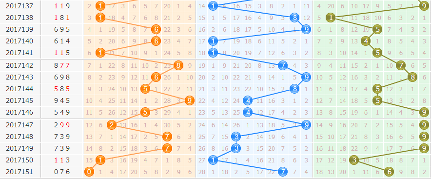 和值分析:上期和值05点,和值走势下降,近期和值走势波动较大,本期重点和值关注13防17点。