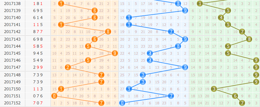 和值分析:上期和值14点,和值走势上升,近期和值走势波动较大,本期重点和值关注13防14点。