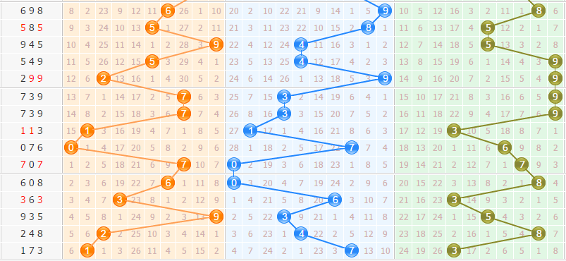 本期号码上数十期开奖号码为739,百位7,对应数2,补数3;十位3,对应数8、补数7;个位9,对应数4、补数1。