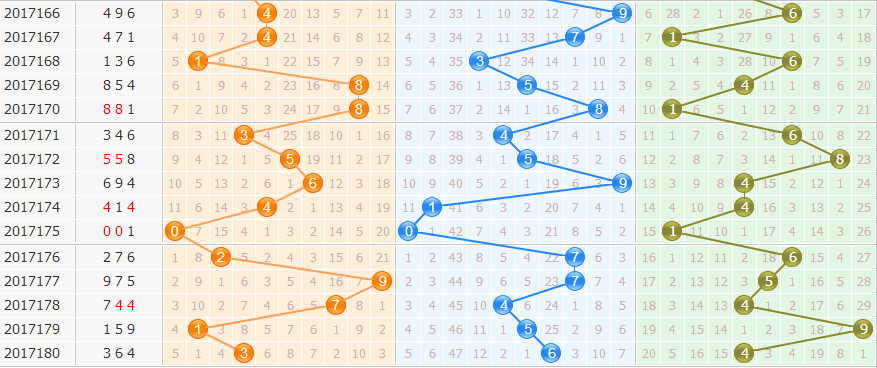 012路分析:180期除三余数开出001路,从整体的出号情况来看,下一期的012路比值重点设防1:1:1、1:0:2。